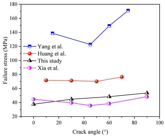In addition, a comparison was made between our test results and those obtained by other researchers, as displayed in Figure 11. Table 3 presents the experimental schemes of the other researchers. It can be seen from Figure 11 that the peak stress of the cracked sandstone under monotonic uniaxial compression first decreased and then increased with an increase in the crack angle, while the peak stress of the pre-cracked sandstone under stepped cyclic uniaxial compression increased linearly. This indicates that the failure stress of pre-cracked rock was sensitive to both the loading path and the crack angle. The stepped cyclic loading made the crack compaction more predominant, and thus, increased the strength of the sandstone. However, compared to the crack angle, the stress path exerted a more pronounced effect on the peak stress of the pre-cracked rock.