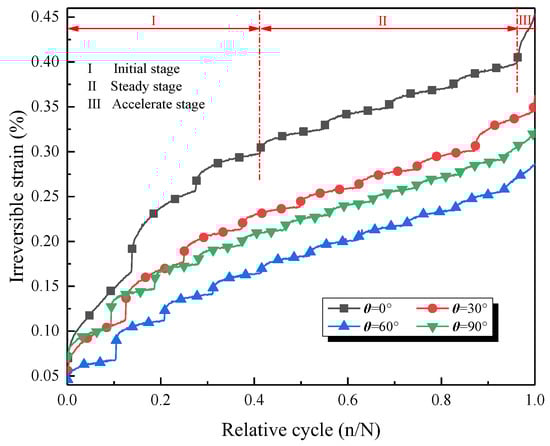 The irreversible strains of all the specimens were calculated separately using Equation (1). Figure 12 shows the changes in the irreversible strain during the entire stepped cyclic loading process. Although the crack angles were diverse, the irreversible strains all exhibited a consistent variation trend throughout the entire stepped cyclic loading process. The entire loading process can generally be divided into three stages: the initial stage (stage I), the steady stage (stage II), and the accelerated stage (stage III), as illustrated in Figure 12. Each stage was characterized by different mechanical behaviors and mechanisms. In stage I, the rock specimen underwent a crack compaction, which was characterized by the closure of pre-existing microcracks within the rock specimen. These pre-existing microcracks were sealed up when the force was applied because the mineral grains within the rock specimen were pushed closer. In stage II, the mechanism of deformation was the stretching and bending of the mineral grains within the rock specimen. The mineral grains within the rock specimen were forced to deform elastically under loading. This deformation was reversible, meaning that the rock specimen would return to its original shape when the force was removed. However, as the force was applied repeatedly in this study, stable micro-elastic cracks initiated within the rock specimen at a force level. In stage III, the deformation mechanism was the propagation of the macroscopic cracks through the rock specimen due to the stress concentration at the tips of the cracks. The propagation of the cracks led to a sudden drop in the load-carrying capacity of the rock specimen, resulting in failure. In summary, these three stages were characterized by the closure of pre-existing microcracks within the rock specimen, the elastic deformation of the mineral grains within the rock specimen, and the propagation of macroscopic cracks through the rock specimen due to the stress concentration at the crack tips.