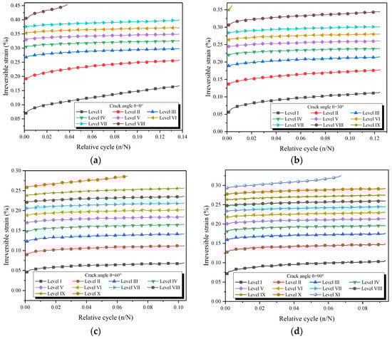 Changes in the irreversible strain of the pre-cracked specimens at different force levels: (a) Ɵ = 0°, (b) Ɵ = 30°, (c) Ɵ = 60°, and (d) Ɵ = 90°.