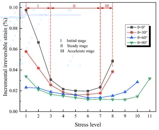 The irreversible strain of the rock specimens refers to the difference between the strains recorded at the end and the beginning of a cycle. By processing the collected test data, the strains recorded at the beginning and the end of each cycle were calculated. Then, by substituting the data into Equation (1), the incremental irreversible strain of each cycle was attained.