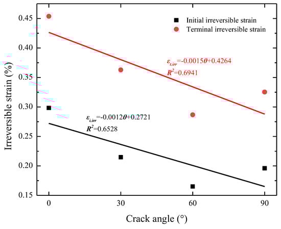 In order to obtain the degree of influence of the crack angle on the irreversible deformation of the cracked rock, the two special types of the irreversible strain were determined, namely the initial irreversible strain (referring to the irreversible deformation at the end of the initial stage) and the terminal irreversible strain (i.e., the final irreversible deformation of the specimens), as shown in Figure 15. It can be seen that the crack angle was negatively correlated with the two types of the irreversible strain. That is, the larger the crack angle, the smaller the two types of the irreversible strain. The slope terms of the linear regressions of the initial and terminal irreversible strains were −0.0012 and −0.0015, respectively. This indicates that the terminal irreversible strain was more sensitive to the crack angle variation.
