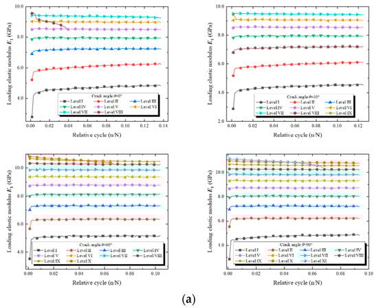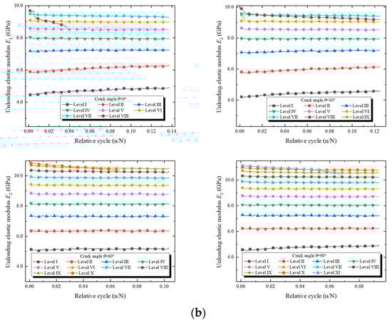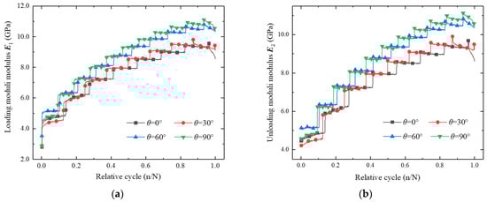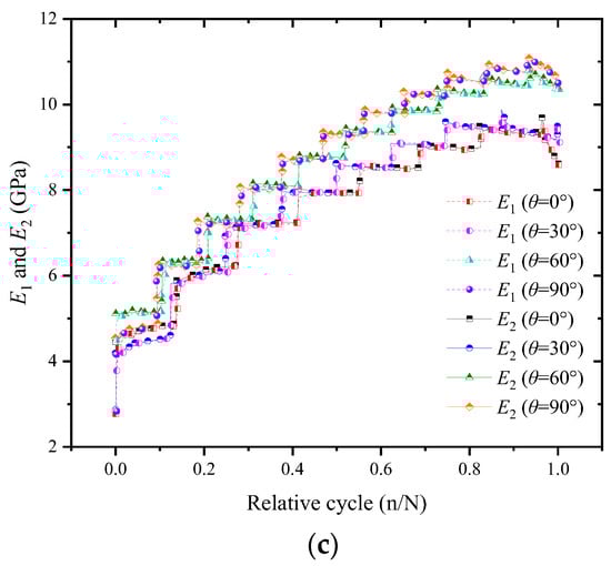 Using the method in Section 3.2, the loading elastic modulus E1 and the unloading elastic modulus E2 of all the specimens were calculated during the entire compression process, as shown in Figure 16. Despite the different crack angles, either the loading elastic modulus E1 or the unloading elastic modulus E2 exhibited a consistent change trend during the entire stepped cyclic loading (Figure 16a,b). As the force level increased, the elastic moduli jumped. Within the force levels, the two elastic moduli showed three types of change: the initial growth type, the basically unchanged type, and the significant reduction type. In general, the loading elastic modulus E1 was slightly smaller than the unloading elastic modulus E2 for the same relative cycle (n/N), as shown in Figure 16c. This was because the rock was an inelastic material that underwent a somewhat plastic deformation during each loading cycle.