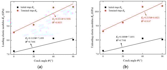 Figure 18 displays the relationships between the two types of elastic moduli (the loading elastic modulus and the unloading elastic modulus) and the crack angle at two specific relative cycles (n/N). These two types of elastic moduli were the elastic moduli at the initial stage (at the end of the first change in the trend of the elastic moduli) and at the terminal stage (at the end of the third change in the trend of the elastic moduli). As shown in Figure 18, it can be seen that the elastic moduli of the rock specimens increased as the crack angle increased. Moreover, there was a significant linear relationship between the two types of elastic moduli and the crack angle. At the initial stage, the unit influence factors of the crack angle on the loading elastic modulus E1 and the unloading elastic modulus E2 were 0.1119 and 0.1089, respectively. In contrast, at the terminal stage, the unit influence factors of the crack angle on these two types of elastic moduli were 0.2211 and 0.2158, respectively. Accordingly, it can be concluded that the larger the crack angle, the greater the elastic moduli, and the greater the deformation resistance of the rock. Correspondingly, the irreversible deformation accumulated in the rock during the entire stepped cyclic loading was reduced and the bearing capacity of the rock was improved. Thus, the compressive strength of the rock increased. This finding was fully consistent with the results obtained in Section 4.2 and Section 4.3.
