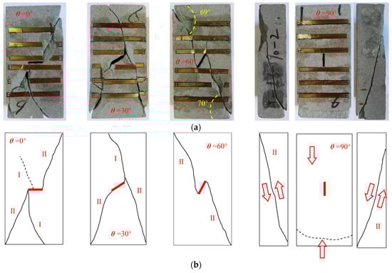 Failure modes of the tested specimens: (a) pictures and (b) schematic diagrams (note: the red line represents the prefabricated crack and the red arrow refers to the potential moving direction of fractured rock pieces).
