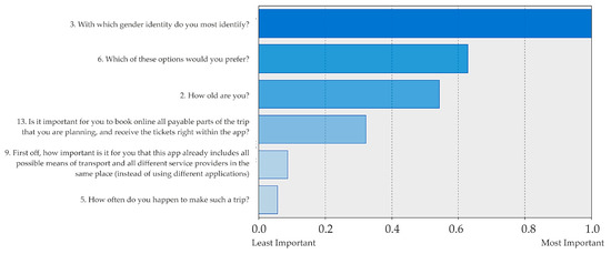 The data from our questionnaire survey led to us obtaining the needs and expectations of potential users within MaaS activities. We used a conversational survey using the Coney tool, while the questions were asked via chat. It was easy to answer the list of questions in the form of an online interview through this platform. The original English version was translated into several languages, while our partial survey used the Czech language. The survey was anonymous and took place from 1 March 2022 to the end of April [43]. The questionnaire was answered by respondents over the age of 18. The questionnaire was divided into two sections: a socio-demographic section (age, gender, social status) and an application section focusing on functionality and user-friendliness. We segmented users using two-step cluster analysis in the statistical analytical program SPSS 26. This program was used to calculate the relative importance of the predictor (see Figure 1) based on the formula below.