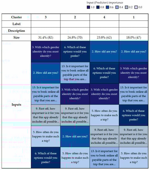 Figure 2 shows that the respondents are divided into four clusters. These clusters are made up of respondents with similar demographic characteristics and preferences for using applications. As can be seen, these clusters are created using six input categorical variables such as gender, age category, trip frequency, and user preferences. The color scale distinguishes predictors by within-cluster importance (see the legend).