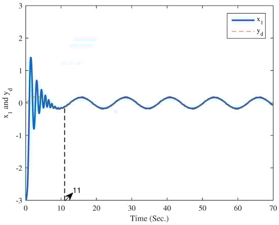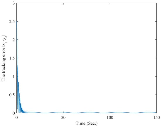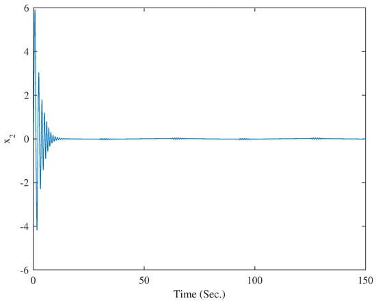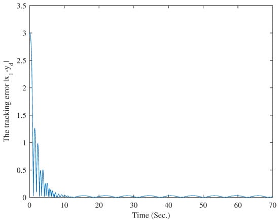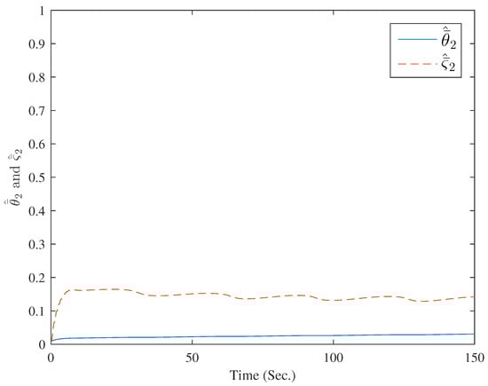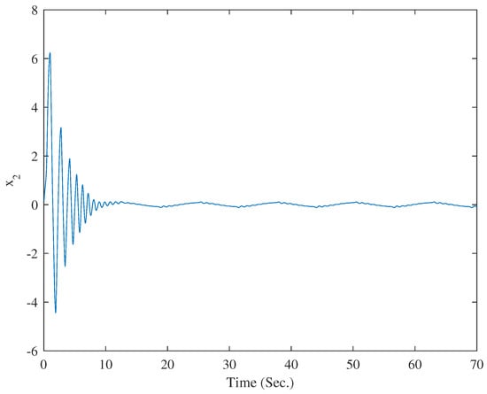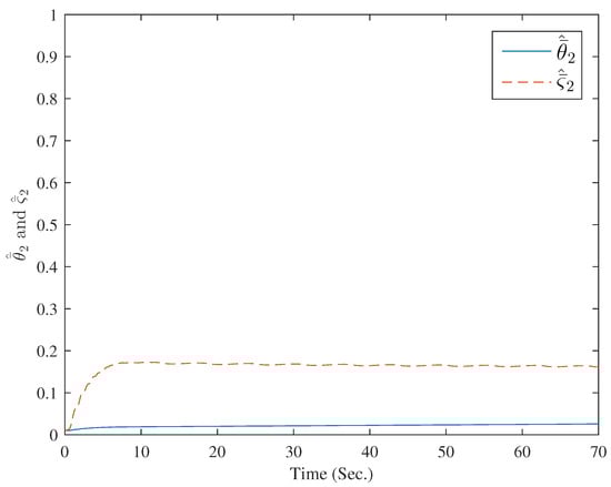 For two cases, the simulation results are given in Figure 1, Figure 2, Figure 3, Figure 4, Figure 5, Figure 6, Figure 7, Figure 8, Figure 9 and Figure 10. The response curves of the states , and are shown in Figure 1 and Figure 2 for case 1, respectively. The curve of tracking error is shown in Figure 3. It can be seen that the output y can track the reference signal within 10 s for case 1. The curve of control signal is given in Figure 4. The curve of adaptive laws are given in Figure 5. For case 2, the simulation results are given in Figure 6, Figure 7, Figure 8, Figure 9 and Figure 10. The response curves of the states , and are given in Figure 6 and Figure 7 for case 2, respectively. It can be seen that the output y can track the reference signal within 11 s for case 2. The curve of tracking error is given in Figure 8. The curve of control signal is given in Figure 9. The curve of adaptive laws are given in Figure 10. Accordingly, the simulation results are given in Figure 1, Figure 2, Figure 3, Figure 4, Figure 5, Figure 6, Figure 7, Figure 8, Figure 9 and Figure 10, where it can be seen that the feasibility of the developed finite-time control strategy in handling unmodeled dynamics and actuator fault problems. Furthermore, the good tracking performance can be ensured within finite-time under the derived adaptive finite-time fuzzy control protocol for the two cases.