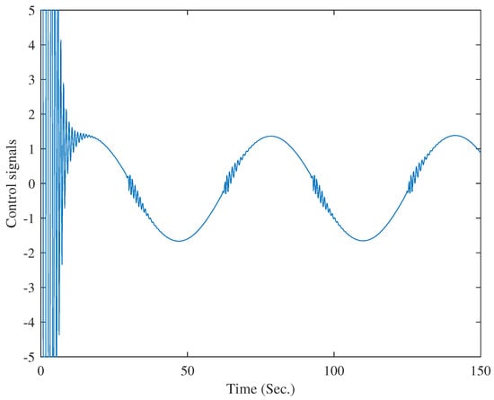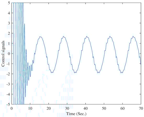 where q and F denote the arm’s position and control input signal, respectively. R = mgL with L = 1 m is the link length, g = 10 N/kg refers to gravitational acceleration, and m = 1 kg refers to the load mass. M = 1 refers to mechanical inertia. N = 1 N·m·s/rad refers to the coefficient of viscous friction. denotes dynamic uncertainty. The dynamic signal is denoted as .