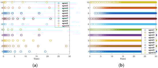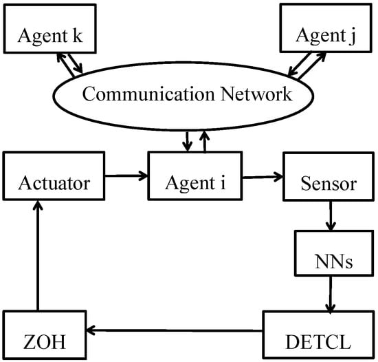 As a result, the time-triggered mechanism may lead to unnecessary waste of resources due to the lack of explicit regulations for choosing appropriate triggered intervals. The event-triggered mechanism, on the other hand, adopts the zero-order hold (ZOH) method, which means that the control input remains constant until the next triggered instant, reducing the communication load. Figure 2 illustrates the structure of the MASs with DET mechanism. Moreover, it can be observed from (9) and (10) that and act as dynamic thresholds for the DETC scheme, serving as positive scalar functions. A similar proof can be made as in [41]. The dynamic threshold helps to decrease the number of triggers compared to the static case [20,21,22,23,24,25,26], resulting in less frequent triggers overall.