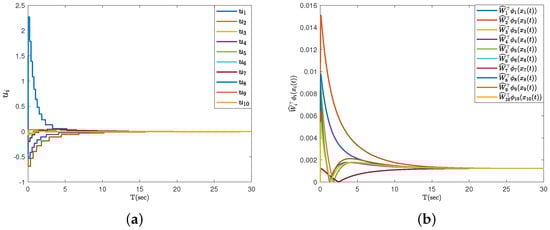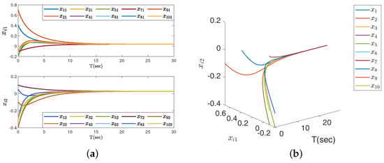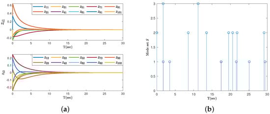 We create the distributed DETC (8) to achieve system (1) consensus. Let ; ; ; ; ; ; ; ; ; ; ; ; ; ; and use the LMI toolbox to solve the inequality (11). We obtain . Moreover, and the sampling time of simulation is set at 0.001 s. The simulation findings are shown in Figure 4, Figure 5, Figure 6 and Figure 7. The uniformly bounded consensus control is demonstrated by the state trajectories in Figure 4 and the error trajectories in Figure 5a, which provide evidence that our control strategy is effective. Nevertheless, Figure 5b, Figure 6a,b and Figure 7a exhibit the mode of Markovian switching, the control inputs , the NNs estimator, and the triggering instants of each agent under the DETC law (8), showing that the interval between two consecutive triggering instants increase and the number of triggerings decrease, indicating the efficacy of our DET method.