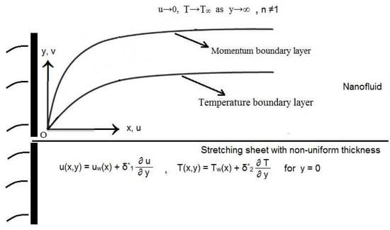 where u and v are the velocity components along the x and y directions, respectively, is the kinematic viscosity, T is the temperature of the fluid, k is the thermal conductivity, is the thermal diffusivity of the nanofluid, is the specific heat capacitance, is the dimensional velocity slip parameter and is dimensional temperature jump parameter, these are given by , , . Here and are mean free paths and is the ratio of specific heats, b and c, respectively, indicating Maxwell’s reflection coefficient and thermal accommodation coefficient.