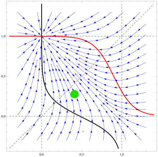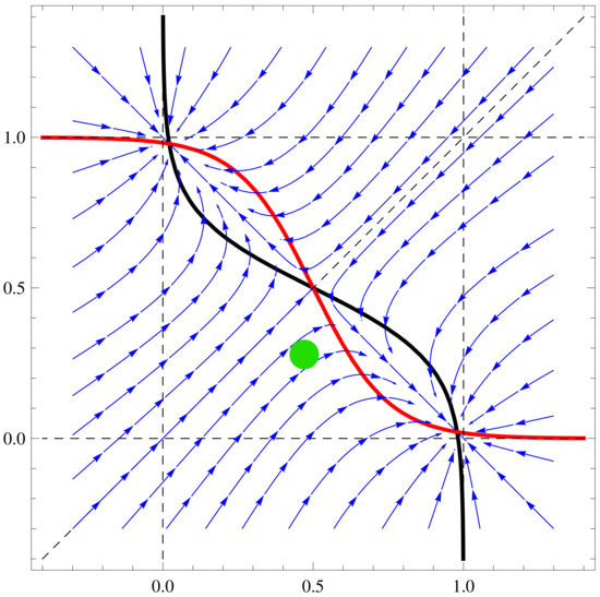 The goal is to redirect the current trajectory, emanating from the green spot, to the upper right critical point, which is conventionally the “normal” one. This can be achieved by manipulating the adjustable parameter . Change from its current value −0.5 to the value 0.1. This corresponds to the shift of the first nullcline (black one) down. As the result, only one, the upper left, critical point remains, and their type is not changed. It is a stable node. The effect of this action is seen in Figure 2. The flow of the vector field will lead the green spot to the left upper, now unique, critical point, which is identified as “normal” attractor. The goal is achieved, and the system will go to the right state.