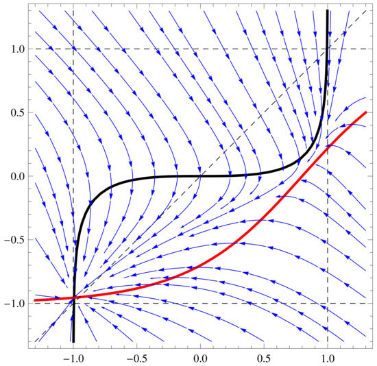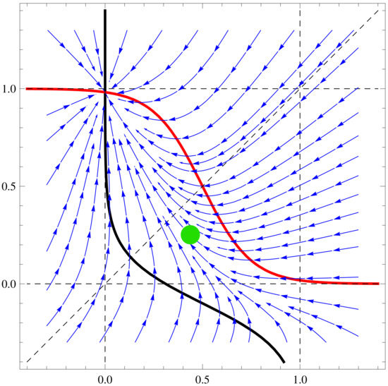 It is clear that changing both parameters in (13) will lead to the shifting of both nullclines. The second nullcline (red one) can move in a horizontal direction. The change of the parameters and from their current values to the values 0.01 and −0.9, respectively, will lead to the configuration depicted in Figure 3. The selected trajectory will go to the desired attractive critical point at the upper-left corner.