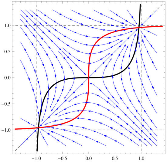 arise in the theory of artificial neural networks ([27], Chapter 6). The hyperbolic tangent function is a sigmoid function, but its range of values is . The invariant domain for the system (15) is the open cube . The nullclines are defined by the equations