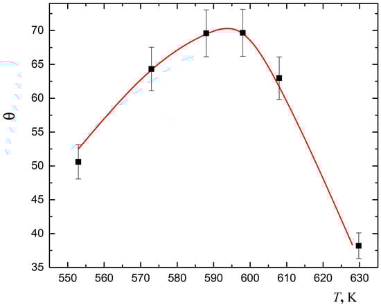 Figure 1 demonstrates good performance of the developed model for interpretation of experimental data on the dependence of the sensor effect () on temperature (T). Details of the experiment are available in []. The resistance of the film of , laid over a dielectric substrate, was measured for the two cases: (i) in the stream of air, and (ii) in the stream of air with addition of . The sensor effect is a ratio of these resistances. The measurements were conducted at various temperatures. The results were verified using five different samples of the film. The maximum error in resistance measurement was 2.5%.