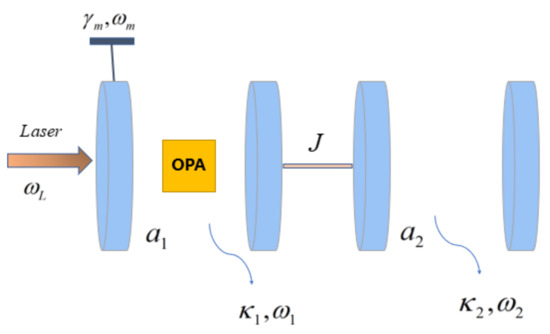 The model that we consider is a coupled single-mode double-cavity, as shown in Figure 1. The left and right optical cavities are cavity and cavity , respectively. The left cavity is an optomechanical system and the right cavity is a standard optical cavity. The two cavities are coupled to each other through photon exchange coupling with the coupling coefficient . A degenerate optical parametric amplifier is placed in the left cavity. The resonance frequency and decay rate of the left cavity are and , respectively, and the resonance frequency and decay rate of the right cavity are and , respectively. The movable cavity mirror in the left cavity can be regarded as a mechanical oscillator with a natural frequency of , effective mass , and damping rate . The system is in a state of thermal equilibrium at temperature . In addition, the left cavity is driven with an input laser field with frequency , power and amplitude , which does not interact directly with the right cavity.