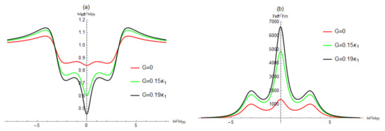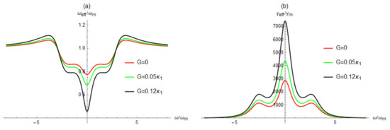 In Figure 2, we fixed and plotted the curves of the normalized effective resonance frequency , which normalized the effective damping rate versus the normalized effective resonance frequency , when (red solid line), (green solid line), and (black solid line), respectively. According to Figure 2a,b, it can be seen that both the normalized effective resonance frequency and the normalized effective damping rate are symmetrically distributed within the selected interval as the normalized effective frequency changes, and are symmetric about the longitudinal axis. When , there is no optical parametric amplifier placed in the left cavity. In Figure 2a, while is from to and from to , the normalized effective resonance frequency of the mechanical oscillator remained basically unchanged. Then, as the value of increases in the left half-axis and decreases in the right half-axis, the normalized effective resonance frequency will suddenly decrease. When , the normalized effective resonance frequency has a minimum value. When an optical parametric amplifier is placed in the left cavity, the image of the normalized effective resonance frequency still shows a symmetrical distribution. However, the difference between this situation and the absence of an optical parametric amplifier in the cavity is that when the normalized effective resonance frequency reaches a subpeak, it rapidly decreases and reaches a minimum value. It is worth noting that when , its normalized effective resonance frequency is lower than the value when . In Figure 2b, when , the normalized effective damping rate of the mechanical oscillator shows three peaks in the selected region, with two subpeaks appearing at approximately and , with the maximum value appearing at . However, the difference between the maximum and sub-maximum values is not significant, and as it extends along the left and right half axes, the value of the normalized effective damping rate gradually approaches zero. After adding OPA, the overall trend of the normalized effective damping rate is similar to without OPA, yet the difference is that the peak value of the normalized effective damping rate suddenly increases several times. Moreover, the peak value at is greater than at , and it is found that this pattern corresponds to the normalized effective resonance frequency. That is, at , the larger the normalized effective frequency of the mechanical oscillator, the smaller its normalized effective damping rate . Figure 2 also shows that with the increase of parameter gain G, the normalized effective resonance frequency decreases, while the normalized effective damping rate increases . However, it is worth noting that a larger value of G is not necessarily better, which indicates that adding OPA to the dual cavity can effectively assist in the cooling of the mechanical oscillator. Similarly, we also selected , , and , as well as the parameter phase , to observe the changes in the normalized effective resonance frequency and normalized effective damping rate of the mechanical oscillator by increasing the parameter gain . As shown in Figure 3, it can be observed that the change in curves presented in Figure 3 is similar to Figure 2. In addition, the influence of the values on the normalized effective resonance frequency and normalized effective damping rate is also discussed. It is found that when , the normalized effective resonance frequency achieves the minimum value, while the normalized effective damping rate reaches the maximum value. Therefore, in the following discussion, we take for simplicity.