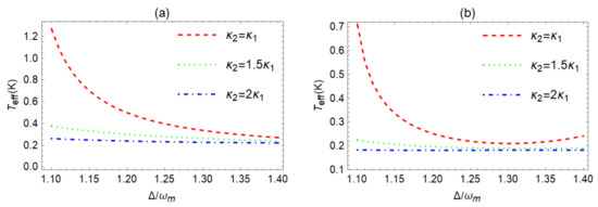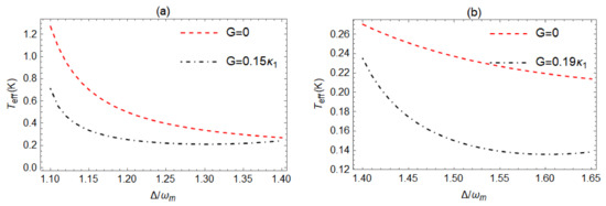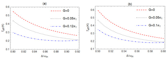 It can be seen that when the parameter gain exists, the effective temperature of the mechanical oscillator is significantly improved. As the parameter gain increases, the cooling effect of the mechanical oscillator becomes more obvious, and the oscillator has a lower temperature. Furthermore, for the different parametric gain, the process of cooling corresponds to different ranges of the detuning of the effective cavity. For the parametric gain , the temperature can drop to , when . For the parametric gain , the effective temperature can arrive at , when . Similarly, we also plotted the effective temperature with or without the parametric gain , when and , as shown in Figure 5.