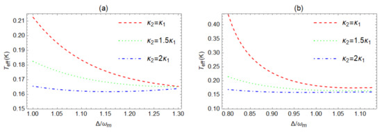 In Equation (18), the first two terms are the contribution of the input vacuum noise, and the last term is the contribution of the thermal noise. When we take the Fourier transform of in Equation (7), we can get , which makes the momentum fluctuation spectrum of the mechanical oscillator . For a system in thermal equilibrium, we can use the energy equipartition theorem to define the effective temperature , which is determined by the total energy of the mechanical oscillator. Note, we are dealing with a drive system here, and [34], where , . Through analysis, we find that the cooling of the mechanical oscillator is related to the decay rate, detuning, coupling coefficient, and OPA gain coefficient of the two cavities.