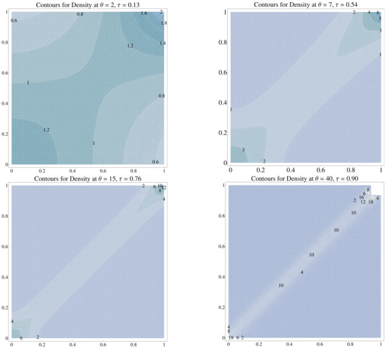Figure 2 and Figure 3 exhibit the contour plots of the half-logistic copula and its copula density for different correlation levels in terms of Kendall’s tau correlation coefficient . From the graphs, it is noticeable that the half-logistic copula is increasing in the dependence parameter (a mathematical proof is provided at Theorem 4). Also, the contour curves are steeper for small values of , i.e., the copula increases faster with smaller values of the parameter (i.e., weaker correlations). The copula density takes higher values when and takes its maximum at the point (). Also, it seems that as the dependence parameter increases (i.e., the correlation increases), the density gets steeper.