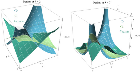 Figure 5 exhibits the density of the two-parameter half-logistic copula at , with the special cases of the Frank copula and the half-logistic copula.