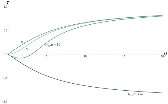 Figure 4 exhibits the plot of Kendall’s tau coefficient for the half-logistic copula. Notice that takes a range between 0 and 1 at and , respectively.