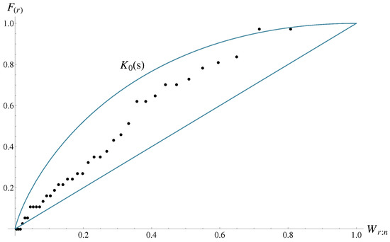The scatter plot of these data is shown in Figure 7. It seems that there is no special relationship between large (or small) values of the variables, i.e., these data have no upper (lower) tail of dependence. The Spearman’s rho and Kendall’s tau measures of correlation are, respectively, and , with both corresponding p-value , which indicates a strong positive correlation. This is also confirmed by the K-plot at Figure 8, where the dots lie far above the main diagonal. Therefore, we guess that the half-logistic copula will give a good fit.
