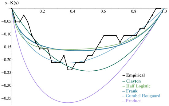 A plot of the Lambda function for the empirical data against the copulas is depicted in Figure 9. In this plot, Gumbel–Hougaard, Frank, and half-logistic copulas give the best matches to the empirical curve. The values of the goodness-of-fit test statistics with their corresponding p-values are presented in Table 1. Our results are the same as those of Mesfioui et al. [35] for the Frank and Clayton copulas. The maximum likelihood estimates of the parameters using the full maximum likelihood method (FML) with the corresponding Akaike information criterion (AIC) and Bayesian information criterion (BIC) values are tabulated in Table 2.