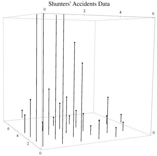 These data were first discussed by Arbous and Kerrich [36]. The data consist of 122 shunters’ major accidents on the South African Railways recorded in the period 1937–1947, inclusive. Arbous and Kerrich [36] adopted the belief that most of the accidents occurred to a small part of the employees. So, after a period of time from the beginning of the study, they omitted the number of accidents corresponding to those individuals with the highest numbers of accidents and examined if the annual number of accidents would be significantly reduced in the following years. The first variable represents the number of accidents for the first six years, and the second variable represents the last five of them. A plot of these data is presented in Figure 10. The sample mean and sample variance for each period are, respectively, and . The correlation between the occurrence of accidents in the two successive periods is 0.28. They showed that for each period’s dataset, a Poisson distribution gives a good fit for the data, but the Poisson distribution is not adequate to fit the whole dataset over the 11-year period. Kocherlakota and Kocherlakota [37], in their book, modeled the data by the Marshal–Olkin model with negative binomial marginals and obtained the MLEs. Barbiero [38] concluded that discrete Weibull distributions are more suitable to model the marginals. Thus, he fitted the data with the FGM copula using discrete Weibull margins.