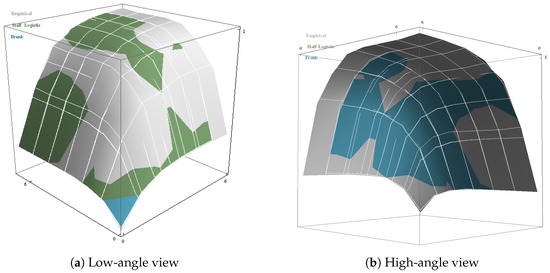 In terms of AIC and BIC values, the half-logistic and the Frank models with discrete Weibull margins seem to give the best fits. Also, one can notice that the truncated Poisson copula fits poorly, which is expected since the truncated Poisson copula is only suitable for datasets with smaller correlations. Figure 11 exhibits the cumulative distribution functions of these two models with the empirical one. In most areas of the graph, the Frank copula is beneath the half-logistic copula, except in a small area near the point . The surfaces of the half-logistic and the Frank copulas alternately go up and down around the surface of the empirical cumulative distribution.