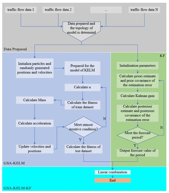This section briefly introduces the gravitational search algorithm, kernel extreme learning machine, and Kalman filter as shown in Figure 1. Then, we employ GSA-KELM and KF to forecast traffic flow. Lastly, we detail the combination of GSA-KELM and KF.