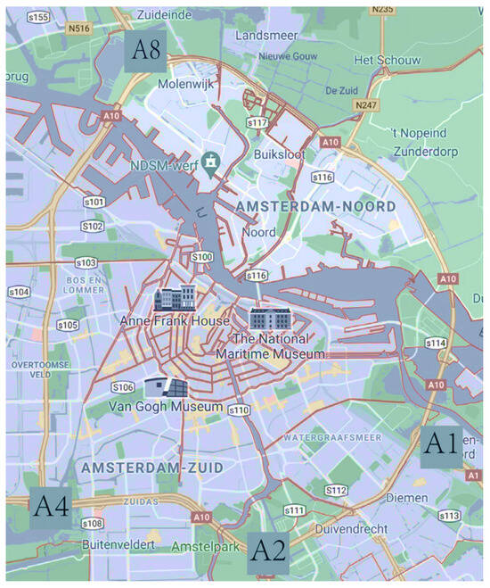 The Amsterdam highway dataset was collected on four motorways, namely, A1, A2, A4, and A8, in Amsterdam, the Netherlands. The basic conditions of the four expressways are shown in Figure 2. The four benchmark datasets, each of which consists of five weeks of data collected by the MONICA annular detector from 20 May to 24 June 2010, are aggregated by vehicles per minute and hour. Traffic flow data of 1 min are aggregated into 10-min aggregation in the same method. In the raw data, erroneous data are mixed, e.g., zero or negative for a long time. The average of the measurements at the same time in other weeks is used to revise them.