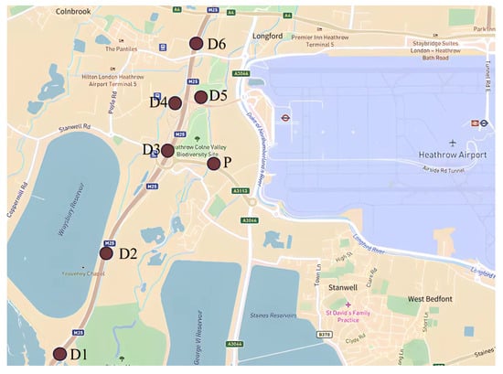 Location distribution of D1, D2, D3, D4, D5, D6, and P, near the Heathrow airport on M25 expressway in England.