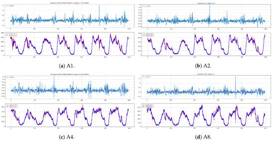 Although RMSE is more suitable for showing larger deviations, MAPE has the simplest interpretation and can be used to compare accuracy between different volumes studied []. Furthermore, MAPE is more suitable for the comparison of long-time series. From Table 2, we know that our GSA-KELM-KF achieves the best performance on MAPE except for the A8 dataset, with results of , , , and , respectively. Compared with LSTM, the MAPE of the GSA-KELM-KF decreases by , , , and on the A1, A2, A4, and A8 datasets, respectively. Compared with ELM, the MAPE of our GSA-KELM-KF on the A1, A2, A4, and A8 datasets decreases by , , , and , respectively. Similarly, the MAPE of our GSA-KELM-KF is lower than KELM by , , and , respectively.