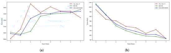 Visualization of GSA-KELM-KF and KELM models when the true values fluctuate significantly, (a,b) are at peak flow in the morning and gradually decreasing at night, respectively.