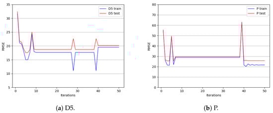 The RMSEs forecasting results of GSA-KELM by different numbers of iterations on D5 and P datasets.