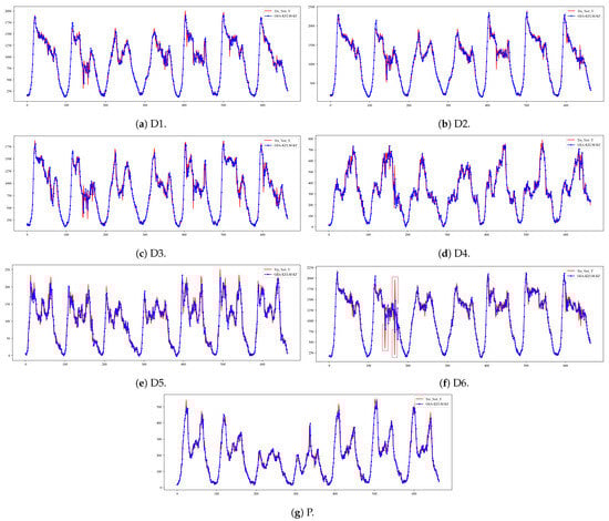 In Figure 5b, traffic flow gradually decreases at night. In this case, the traffic flow dropped relatively smoothly from 1100 vehicles per hour to 300 vehicles per hour. In this case, our GSA-KELM-KF can predict this change more accurately, prevent KELM from overshooting, and achieve more reasonable predictions.
