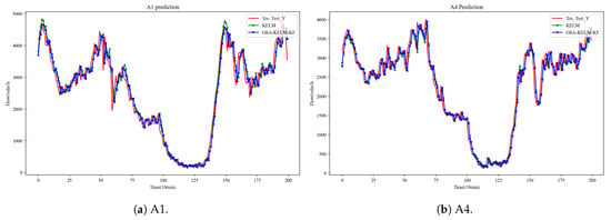 In Figure 5a, the morning peak traffic flow ranges from 2900 to 3500 vehicles per hour. Traffic flow fluctuates greatly during this stage, and it is difficult for KELM to capture these rapid fluctuations. In this case, our GSA-KELM-KF prevents KELM from falling behind, effectively mitigating the shortcomings of sudden performance drops due to drastic traffic changes. This is extremely important in intelligent transportation systems and is a key issue in traffic management and traffic information release.
