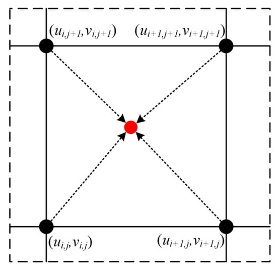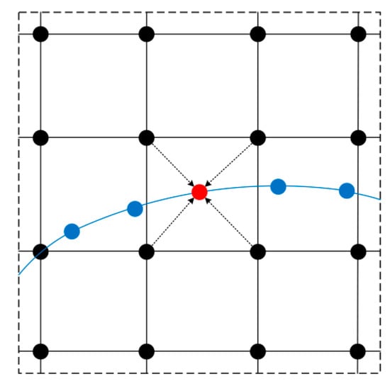 The interface marker points are not restricted to the Eulerian staggered grid described above, but are Lagrangian points with time as the independent variable, allowing for a maximally realistic and smooth description of the interface. In order to make the interface move over time in the calculation, it is necessary to calculate the speed of each interface marker. The coordinates of the interface markers do not coincide with the Eulerian grid points in the flow field, so it is necessary to interpolate the velocity information of the Euler staggered grid points to obtain the velocity of the interface markers. As shown in Figure 1, the black point represents the Euler grid point and the blue and red points represent the interface. When calculating the velocity of the red interface mark point in the figure, the four grid points closest to the interface point should be taken as reference, and the velocity at the four grid points should be interpolated to the red interface point by using the area interpolation method with corresponding weights. One can obtain the velocity at that point.