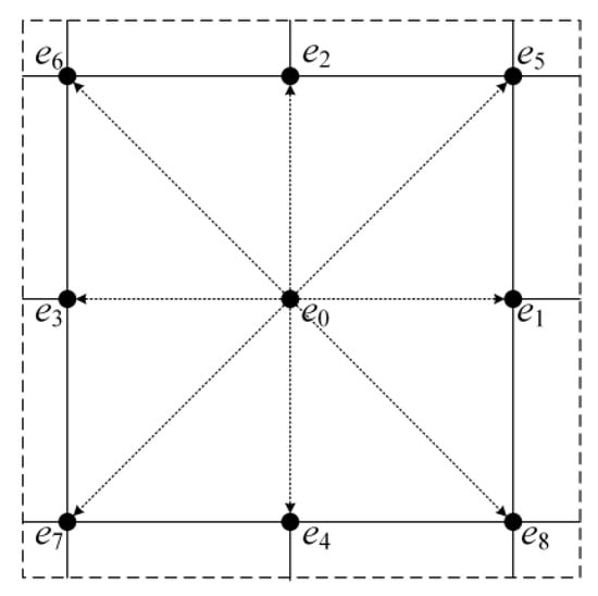 where is the discrete velocity in the direction , is the particle movement time, is the particle distribution function in the direction , and is the particle distribution function at the equilibrium time in the direction . The present work employs a D2Q9 LBM model; i.e., the discrete velocities are spatially labeled in nine velocities, as shown in Figure 2, and the discrete velocities can be expressed as: