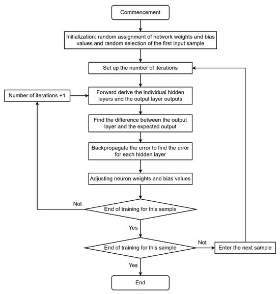 The Bayesian-Regularized Back Propagation Neural Network (BRBPNN) model, which will be referred to as the BPNN model later in this paper, has an algorithmic flow, as shown in Figure 3, which is divided into the following five main steps: