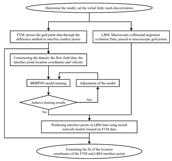 All of the above coupling algorithms only solve the flow field via the LBM, and then substitute the LBM velocity field into the FTM to update the velocities and positions on the interface points, realizing the explicit tracking of the interface points. However, the FTM will automatically update the interface marker points when realizing the accurate evolution of the phase interface, and when the phase interface is fused or ruptured, it is necessary to manually set the conditions for adding or deleting marker points, which will lead to a slight lack of mass conservation at the interface. Thus, there is the problem of a lack of mass conservation in the explicit tracking of the evolution of the phase interface via the FTM, and this will affect the accuracy of the simulation to a certain extent. Secondly, although machine learning has more applications and is a powerful tool in fluid mechanics research, it has not yet been applied to the coupling of two algorithms: the FTM and LBM. The core idea of this algorithm is to mark the phase interface with the lattice unit thickness in the LBM by using the interface point marking in the FTM, and the marking process is implemented by using a neural network model based on machine learning, thus realizing the marking of the interface points in the LBM by obtaining the intrinsic functional relationship between the flow field information and the interface information in the FTM. This makes the phase interface in the flow field of the LBM clearer and more accurate; however, the optimized flow field is not involved in the whole calculation cycle to ensure the mass conservation over the whole calculation process. The physical information of the flow field and the phase field is realized by the multi-relaxation lattice Boltzmann multiphase pseudopotential model. Since the multi-relaxation lattice Boltzmann multiphase pseudopotential model has the advantage of automatically generating and evolving phase interfaces, the updating of the flow field can be realized more easily and efficiently and the pseudopotential model can be coupled with the FTM to better simulate fluid systems with multicomponent, multiphase interfacial dynamics (e.g., multiphase flow, interfacial phenomena) compared with the single-phase, single-component LBM.