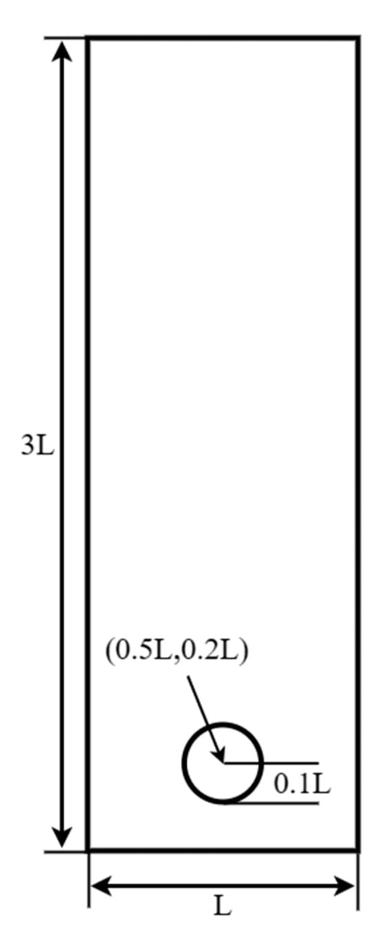 Since droplet rises are very common in fluid dynamics, in this paper, we chose to take a vacuole rise as the object of study. Figure 5 shows the diagram of the drainage basin used in the study of a single vacuole rise in the present paper. In the FTM simulation, the flow channel area is calculated as a rectangular area, and filled with a liquid of density and dynamic viscosity , and the width and length of the domain are 1 L and 3 L, respectively. A grid of 100 in the x direction and 300 in the y direction is established on the basin, so the dimensionless grid length is 0.01 L. At the initial time, a circular vacuole with a diameter of 0.1 L, density and dynamic viscosity is released at a certain position (0.5 L, 0.2 L). The surface tension coefficient is , the gravitational acceleration is g, and the boundary is a no-slip boundary. In the current paper, the rise time of the model was chosen to be 3 s and the time node was chosen to be 300 steps, so the dimensionless time step is 0.01. The control group is set to: