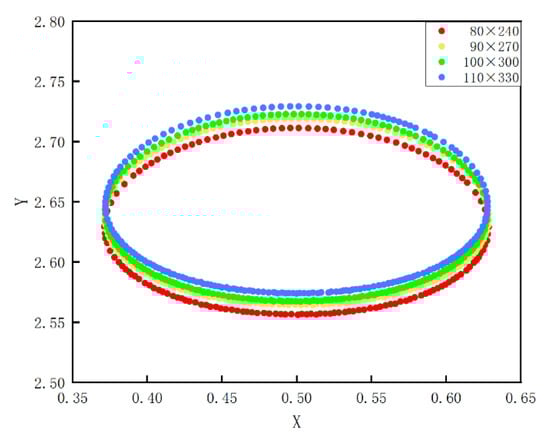 As shown in Figure 6, a uniform staggered grid is used for the calculation in the present paper. For the grid independence study, four different grids with grid points of 80 × 240, 90 × 270, 100 × 300 and 110 × 330 were used. When the dimensionless time is 300, comparing the rising position and morphological change of the final state of the vacuole rising process of these four grids, it can be seen that the difference between 80 × 240 and 110 × 330 grids is very large and the difference between 90 × 270 and 100 × 300 grids is very small, and this difference is within the allowable error range. Considering the accuracy and cost of the calculation, a grid of 100 × 300 was selected for the subsequent model.