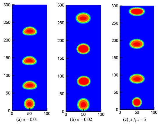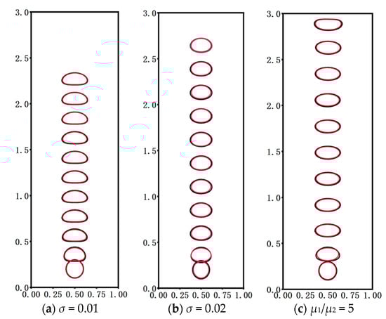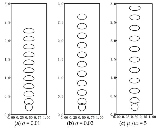 As shown in Figure 7, in the current paper, except for the control group, the surface tension coefficient is 0.01 and the dynamic viscosity ratio is 5. After FTM simulation calculations, in the process of vacuole rising, the surface tension of the vacuole decreases with the decrease in the surface tension coefficient. The easier the vacuole is to deform, the greater the deformation rate, which will increase the surface area accordingly. Under the combined action of gravity and viscous forces, it can be evidently seen that the upper surface of the vacuole also fluctuates more than the lower surface. As the dynamic viscosity ratio decreases, the viscous action of the vacuole by the viscous force decreases, and its rising speed will increase accordingly. At this time, the pressure and surface tension of the vacuole are mostly unchanged, and the decrease in the viscous force will increase the velocity gradient of the phase interface, resulting in an increasing deformation rate of the vacuole and a flatter shape of the vacuole in the final state.