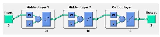 where is the mean square error of the network weights, m is the number of network weights, and a and b are the regularization coefficients of the objective function F, which determines the training objective of the neural network. If , then the training is more inclined to improve the generalization ability of the neural network, but it will lead to a larger training error and underfitting; if , then the training is more inclined to reduce the training error of the network and cause overfitting. Thus, the values of a and b will directly affect the training results of the neural network.