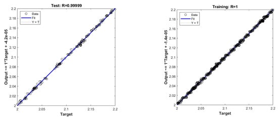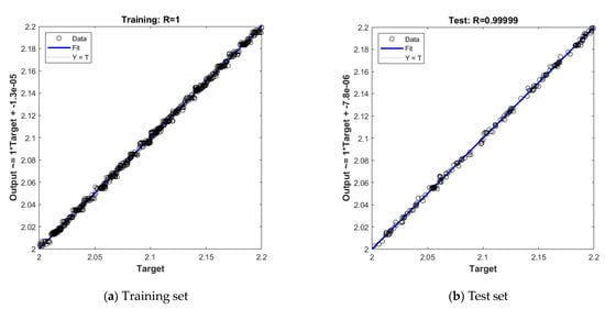 As shown in Figure 13 and Figure 14, by changing the surface tension coefficient, the fit line of dynamic viscosity has a high degree of coincidence with the Y = T line compared with the predicted value (x, y) and output value (dxout, dyout) of the test set and training set under the initial conditions, and the fitting degree coefficient R ∈ [0.99999, 1] indicates that the fitting effect is very good. The accuracy and feasibility of the BRBPNN model meet the requirements, and there are no underfitting or overfitting phenomena. The neural network training was successful, and interface point prediction using LBM numerical simulations can be continued in the next step.