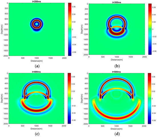 The acoustic wave propagation processes can be displayed at different times with t = 200 ms, 300 ms, 400 ms, and 500 ms (Figure 4). The wavefront is approximated to be a circle at t = 200 ms, shown in Figure 4a, in which acoustic wave propagation only exits in the first layer medium, and its wavefront generates a standard circle. With increasing time, the reflected acoustic wave can be found near the interface of the two-layer velocity model. For example, when the simulation time t is equal to 300 ms, the wavefront exhibits a moderate wave reflection on the interface shown in Figure 4b. Due to the constant velocity in each layer medium, both the refracted wavefront and reflected wavefront will generate approximate circles in the different layers. Meanwhile, when simulation time t is equal to 400 ms, both the refracted and reflected acoustic wave propagation will form standard circle wavefronts (Figure 4c). Figure 4d shows that when the wavefront encounters the left boundary and right boundary of the computational domain, there is a noticeable reflected acoustic wave at t = 500 ms.