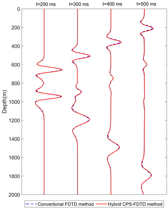 Comparison of the amplitudes of wavefields simulated by the hybrid CPS-FDTD algorithm and the conventional FDTD method. The wavefields are sampled at x = 1000 m for t = 200 ms, t = 300 ms, t = 400 ms and t = 500 ms.