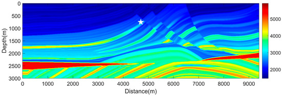 Marmousi velocity model defined a 9400 m 3000 m rectangular computational domain. The minimum velocity is 1500 m/s, and the maximum velocity is 6000 m/s. The white star symbol represents the Ricker wavelet source, which is placed at (4700 m, 750 m).